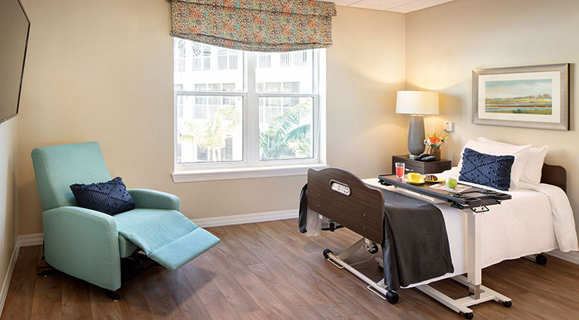 Each person enjoys a fully-furnished, private suite, private bathroom, small kitchenette and wall-mounted smart TV. Personal laundry service and linens are provided along with daily housekeeping. State-of-the-art 24-hour emergency response includes a Real Time Locator System and a hand-held application for staff response and notification.
